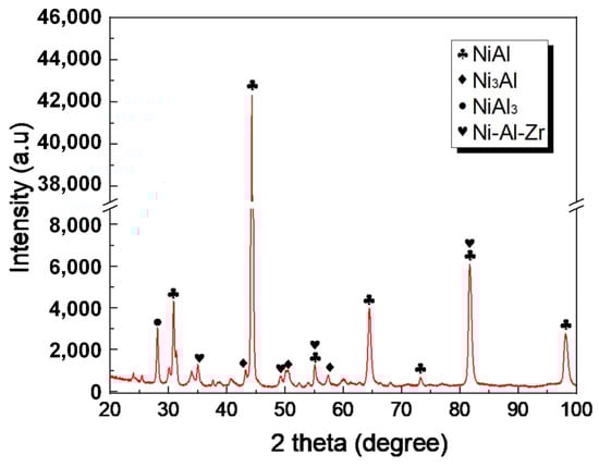 An EDS analysis was performed on each region of the joint, and the results are shown in Table 2. According to the chemical composition and Ni-Al-Zr phase diagram, the bright phase (Position A), light-gray phase (Position B), and dark-gray phase (Position D) were confirmed to be Ni-Al-Zr ternary compounds. The gray phase (Position C) was confirmed to be Ni3Al. The interlayer products were composed of a network-like white phase E and an off-white phase F. According to the EDS results, the white phase E mainly contained Ni, Al, and Zr and was speculated to be the Ni-Al-Zr ternary compound. The off-white phase F was confirmed to the Al-rich NiAl, according to our previous research [22]. An XRD analysis was conducted on the interlayer products. The results in Figure 10 indicate that the NiAl, Ni3Al, NiAl3, and Ni-Al-Zr ternary compounds were detected.