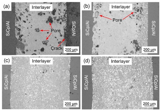The above phenomenon was mainly because the Zr content changed the phase composition of the interlayer products and the release of heat. The previous study [36] indicated that the equimolar Ni-Al reaction system had an adiabatic temperature of 1912 K, which was the melting point of NiAl. During the exothermic reaction, the interlayer products were in a solid–liquid coexistence state. The molar fraction of the liquid in the interlayer products was 42%. According to the analysis in Section 3.2, the addition of Zr transformed the interlayer products from NiAl to the eutectic NiAl + Ni-Al-Zr. Compared with NiAl, the eutectic NiAl + Ni-Al-Zr decreased the melting point of the interlayer products, which also increased the volume fraction of the liquid phase in the interlayer products. During the bonding process, there was more time to densify the interlayer products before their solidification. Under the bonding pressure, the interlayer products were squeezed by the SiCp/Al composites. Thus, it was much easier to eliminate the original pores in the interlayer. The size and quantity of pores decreased with an increase in the Zr content. However, the addition of Zr decreased the released heat. During the bonding process, the SiCp/Al composites absorbed the reaction heat from the interlayer, which had a quenching effect on the interlayer. With an increase in the Zr content, the amount of released heat decreased gradually. The region near the SiCp/Al composites could not react completely due to the heat loss to the substrate. When the Zr content was 15 wt.% or higher, the incompletely reacted region extended to the entire interlayer. The white residual Zr particles dispersed in the interlayer.