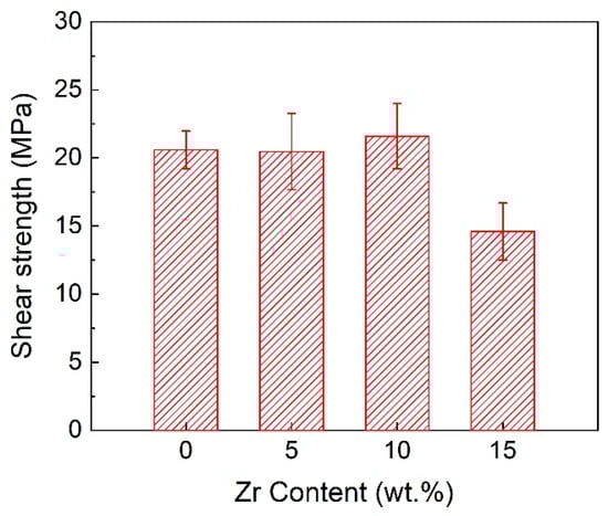 Figure 12 shows the influence of Zr content on the joint shear strength. The Zr content influenced the joint microstructure and defects, thus determining the joint shear strength. When the Zr content was 5 wt.%, many large pores formed in the joint, and the micro-cracks were also detected. When the Zr content increased to 10 wt.%, the size and number of pores decreased significantly. The cracks at the bonding interface disappeared. The interlayer products bonded well with the SiCp/Al composites. Thus, the joint shear strength increased to 22 MPa. The further increase in Zr content significantly decreased the exothermicity of the interlayer. The interlayer could not react completely. The residual metal particles affected the inhomogeneity of materials, and the low exothermicity of the interlayer decreased the atomic mobility at the bonding interface, leading to the weak bonding in the joint. As a result, the joint shear strength decreased dramatically.