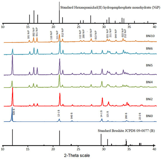 The XRD patterns produced by all samples, including standard brushite (CaHPO4·2H2O) and hexaaquanickel(II) hydrogenphosphate monohydrate (Ni(H2O)6·HPO4·H2O) (HNiP), are presented in Figure 1. The qualitative mineralogical analysis confirmed that after mixing NaH2PO4·2H2O and Ca(NO3)2·4H2O solutions with a Ca:P molar ratio of 1:1 (Table 1), pure brushite (BNi0) is precipitated. Moreover, after nucleation, its crystals grow proportionately to the three major crystallographic planes, i.e., (020), (12-1), and (14-1). In addition, all peaks identified in the pattern produced by BNi0 are indicative of brushite’s monoclinic structure [19,30], while the peak at 11.7° 2-theta suggests that crystal growth primarily progresses along the (020) plane [31].