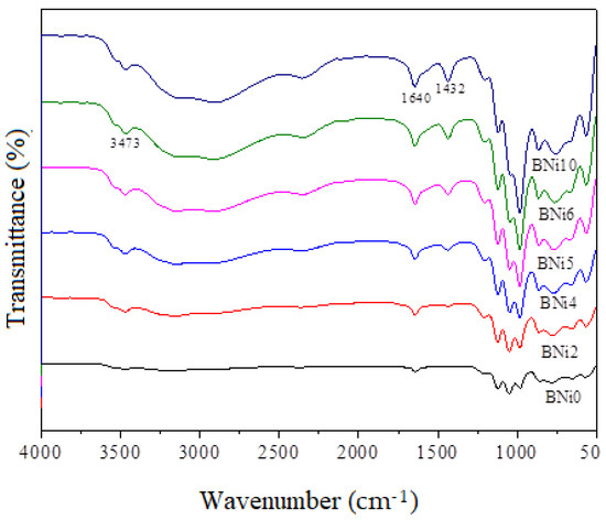 The FT-IR spectrum of the CaxNi1−xHPO4·nH2O compounds is shown in Figure 4. The broad absorption peak between 3500 and 2400 cm−1 is due to O-H stretching vibration [36]. The P-O-P asymmetric stretching vibration band was observed at 983 cm−1 as a result of P=O stretching vibrations; other bands at 654 and 568 cm−1 may be attributed to (H-O-)P=O for acid phosphates [36,37]. Another two peaks were observed at 3470 and 1640 cm−1, indicating the existence of water, and their intensity decreased along with the decreasing trend in brushite contents in the samples (BNi2, BNi4, BNi5, and BNi6), whereas the BiN6 and BNi10 spectra reflected an absence of water [38]. On the other hand, the samples showed new peaks at 1645 and 1432 cm−1, which were respectively indexed to O–H and P–O–bending vibrations, owing to the presence of Ni and its intensity, which reached a maximum in samples BNi6 and BNi10 [39,40].