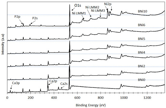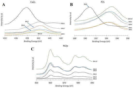 The prepared samples were subjected to XPS analysis to appraise how the Ni/Ca ratio present in the starting solution affected the surface chemistry and chemical state of P, Ca, and Ni as the main constituents of the synthesized CaxNi1−xHPO4·nH2O compounds; these findings are presented in Figure 5. As previously noted, the Ni/Ca ratio affects the degree of substitution of Ca with Ni in brushite as well as the precipitation of HNiP (when higher Ni/Ca ratios are used). The peaks corresponding to the Ni 2p orbital are visible in the XPS spectra of BNi2 to BNi10, and their intensity progressively increases, whereas the intensity of the Ca 2s and Ca 2p peaks decreases almost proportionally with the increase in the Ni/Ca ratio. Meanwhile, the intensity of the P 2s peaks remains nearly constant. This means that the intensity of P, Ca, and Ni peaks depend on the degree of Ca replacement with Ni as well as on the amount of the precipitated HNiP (for higher Ni/Ca ratios).