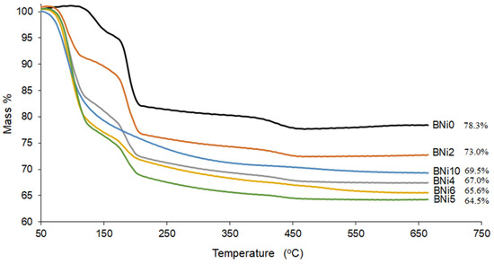 The TGA results for all analyzed compounds (BNi0 to BNi10) are shown in Figure 7. Brushite has a crystal structure made up of compact sheets formed by parallel chains in which Ca ions are coordinated by six phosphate ions and two oxygen atoms belonging to the water molecules, making it a water-bearing phosphate [9]. Moreover, two sharp peaks reflect the mass loss as a result of heating from 80 to 220 °C. Brushite is characterized by two water molecules in its lattice and adsorbed water molecules on its surface [42,43]. Available evidence indicates that some of the chemically-bound water is released as brushite transforms to monetite (CaHPO4) at ≈220 °C [44] and further to calcium pyrophosphate (Ca2P2O7) as the temperature increases to ≈440 °C [8]. According to our results, when pure brushite (BNi0) is heated to 750 °C, approximately 21 wt % of its mass is lost [10], which is comparable to the theoretical mass loss of 20.93 wt % [45]. The BNi2−BNi6 samples with progressively greater Ni/Ca ratios lose more mass (27−35%), while a mass loss of 31.5 wt % is obtained for BNi10 containing solely hexaaquanickel(II) hydrogenphosphate monohydrate.