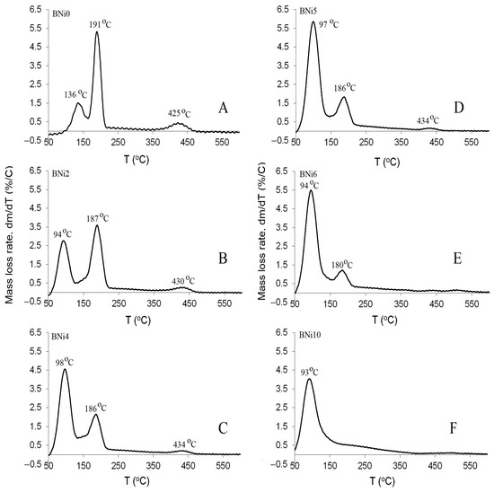 The mass-loss rate for CaxNi1−xHPO4·nH2O compounds as a function of temperature is shown in Figure 8. In Figure 8A–F, the dehydration peaks corresponding to the two water molecules of pure brushite (Bni0) are evident, and they are accompanied by the peaks characterizing the compounds obtained when the Ni/Ca ratio increased from 0.25 (BNi2) to 1.5 (BNi6). As indicated previously [24], partial replacement of Ca by Ni is initially accompanied by limited production of hexaaquanickel(II) hydrogenphosphate monohydrate. However, when the Ca is fully replaced by Ni in the starting solution (BNi10, Figure 8F), a primary zone of mass loss corresponding to HNiP is obtained at approximately 93 °C.