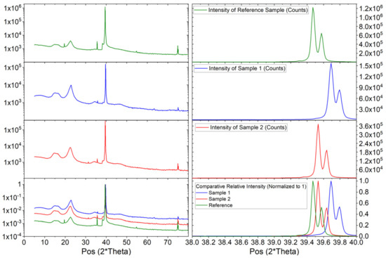 | Reference Sample, Peak 1. | 39.5 | (200) | Sample (10 × 10 × 1.0 mm3) is commercially manufactured by Crystal GmbH [55]. XRD measurement is conducted face-(10 × 1.0 mm2) side up. |