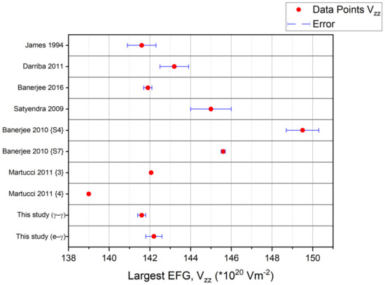 - Banerjee, D.; Das, S.K.; Thakare, S.V. Simultaneous measurement of electric field gradient both at 111Cd and 181Ta sites in a single perturbed γ−γ angular correlation measurement. J. Radioanal. Nucl. Chem. 2017, 313, 677–682. [Google Scholar] [CrossRef]