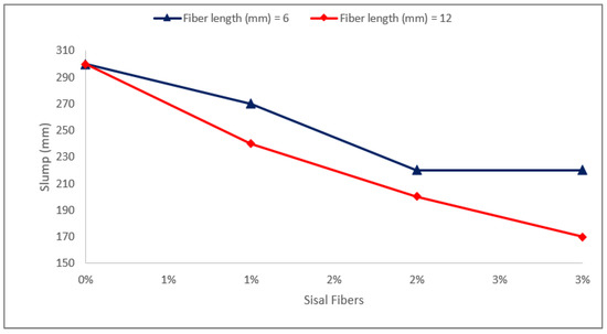 Generally, any kind of fiber decreased the flowability of concrete. Similar trends were seen as demonstrated in Figure 4 [60] and Table 2. The slump value of the concrete mixture was reduced when the SSF content was increased. Fiber additions of 1.0, 2.0, 3.0 and 4.0 percent reduced the decline by 7, 21, 28, and 50 percent, respectively. The viscosity of the concrete mixture rose when the fibers were disseminated into it due to the creation of the binder matrix–fiber network structure; as a result, the mixture’s workability and flowability deteriorated [61]. When a greater quantity of fiber is added to the coating surrounding the fiber, more cement paste is used. This increased consumption lowers the workability of concrete. As a consequence, the mixture that includes 1.0 percent SSF gives the least amount of decrease but could still be sufficiently consolidated [62]. Hemp fiber, however, has a somewhat higher slump value. The amount of air in the concrete grew as the fiber length was reduced, and more air in the concrete had a greater negative impact on the slump [63]. Because of the increased surface area of the fibers, extra water may be essential to cover them, leaving less cement paste available for lubrication. The increase in the surface area of fiber may be attributed to the reduction in the fluidity of concrete mixtures when Cesare is added. Furthermore, fiber increased the frictional resistance among the concrete ingredients and the fiber, requiring the use of additional cement paste to alleviate the inner conflict [64]. Although fibers have many benefits in concrete, they reduce the flowability of freshly mixed concrete [65,66]. Water consumption increases owing to the increased surface area of the fibers. Because of the higher resistance among aggregates and fibers in the mixes, the need for greater potential energy for the ingredients to flow is based on mass [67]. The results are still good, and the decreased droop is due to the fibers absorbing a lot of the water in the mix [68]. Hemp fibers cause the concrete to slump, suggesting a loss of workability. This observation is described by the extreme permeability of hemp strands, which attracts a significant quantity of water for blending. The amount of fiber eaten has a direct relationship with porosity [69]. With the addition of fibers, the slump is reduced. Because fibers absorb water, the higher the fiber–cement ratio, the lower the slump. For larger fiber–cement ratios, it is advised to employ an appropriate super plasticizer that does not impact other attributes except workability. Because of the inefficient bonding of components in concrete with increased fibers, the increased fiber–cement ratio tends to void in concrete, even when completely compacted [70].