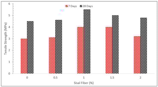 Tensile strength (TS) of concrete improved with SSF, as shown in Figure 8 and Table 5. SSF has a high cellulose content, which accounts for its improved TS and resistance to water absorption. Because of its cost-effectiveness, exceptional acoustic and thermal properties, adequate TS, high toughness, abrasion resistance, and plentifulness, SSF is the most widely used natural fiber in the construction industry [62]. In terms of strength and durability, fiber-reinforced concrete outperforms regular concrete. Fiber stops cracks rather than prevents them. Notably, CF has a larger impact on TS than CS. Fibers have been demonstrated to help post-cracked concrete behave better [53]. Furthermore, fibers with a volume of 0.5 to 2.0 percent have a far bigger impact on concrete TS than fibers with a volume of less than 0.5 percent [54].