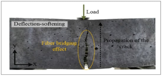 According to the test findings [95], the addition of sisal fibers may increase the compressive strength by around 6% and the tensile strength by about 4% when compared to the reference concrete. This was because the sisal strands store moisture that is gradually released after hydration, aiding in the development of strength. It was determined that raising the fiber content from 0% to 20% by weight increased TS almost three times [55]. Studies stated that fibers enhanced tensile capacity more successfully than CS [6,64]. The CS of the mortars improved with the addition of coir fibers up to 0.5 percent as compared to the control mortar, but it decreased with a higher content of coir fiber [96]. Coconut fibers are the strongest natural fibers, having a TS of 21.51 MPa. They can withstand stresses that are four to six times greater than those encountered by other natural fibers. Various research has investigated the use of coconut fibers for a variety of purposes. The diameter of the fibers is virtually the same, and the levels of TS are similar. The fibroblasts of different individual cells, for example, were affected by kind of plant, its location, and puberty, among other things [56]. The use of fibers in concrete may increase the flexural strength of the concrete [97]. Fiber improves concrete strength by bridging and bearing a portion of the stress [98]. The coaxial TS of jute/epoxy and SSF/epoxy composites was raised by 32% as compared to sisal epoxy. The TS of a hybrid composite was reduced [83]. The tensile and flexural characteristics of ionomer-treated SSF improved as a consequence of uniform stress distribution and the changing of the matrix to scattered fibers, according to certain research [99]. At relatively low fiber dosages of up to 1%, increased fiber content has only a positive influence on concrete TS. Similarly, a significant impact of fiber length on concrete TS was identified for lower fiber levels of up to 1%, with longer fibers being more effective than shorter ones. However, an inverse trend was noted above 1% fiber content. This phenomenon is more noticeable at the extremes of fiber dosages (i.e., 0.1 and 2.5 percent) [91]. Superior impact strength with moderate tensile and flexural qualities are produced by SSF-reinforced composites. When the 2.0 percent dosage was surpassed, however, the strength was reduced [64]. Fibers are employed in concrete to enhance flexibility by delaying the emergence of tension fractures or by preventing the formation of cracks, resulting in a TS of fiber-reinforced concrete that is higher than conventional concrete. Crack stopping rather than crack prevention is derived from the impact of fibers. When compared to other materials, fiber has a bigger influence on TS than compressive strength. The prevention of cracks (bridging effect) of SSF is shown in Figure 9. Fibers have been proven in many studies to boost the TS of post-cracking behavior [100]. At volume fractions ranging from 0.5 to 2.0 percent, which were used in this research, fibers were shown to have a greater effect on TS [101]. Overall, the SSF has the credibility to improve the tensile capacity of concrete in a similar way to the other types of fibers such as steel or carbon fibers.