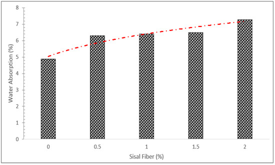 The immersion WA of concrete is a significant feature that provides an indirect indicator of the concrete’s pore structure and endurance in corrosive environments [115]. Figure 10 shows the WA of concrete in the current investigation. The findings show that reinforcing concrete with sisal threads increases concrete’s WA significantly. When 0.5 percent SSF was added to concrete, the absorption rate increased by 28.99 percent after 28 days. Following that, successive additions of 0.5 percent SSF resulted in minimal change until 2 percent SSF was added to the mix, resulting in a 49.176 percent increase in WA above the control concrete. In conclusion, increasing the proportion of SSF in the mix increased the WA of concrete cubes. A similar conclusion was reached by the authors in [116].