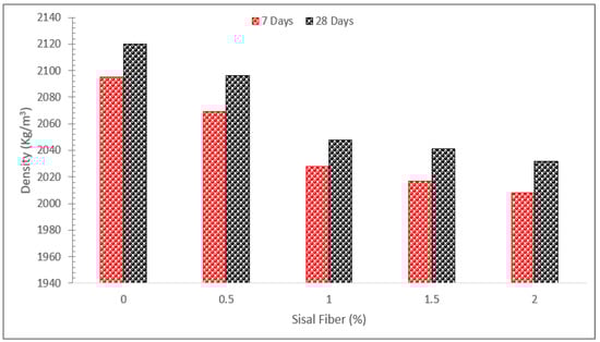 Because of the increasing hydration, the density rose from 7 to 28 days, although the densities at each curing age tend to decrease when the amount of SSF increases, as shown in Figure 11. The results reveal that 0% fiber has the greatest density (2120 kg/m3) and 2% fiber has the lowest density (2032 kg/m3), both of which are beyond the range of structural lightweight concrete and hence may be categorized as normal weight concrete. At 7 days of curing, the density of 0.5%, 1.0%, 1.5% and 2.0% addition of fiber-reinforced concrete was lowered by 1.14%, 3.41%t, 3.74%, and 4.18%, respectively, when compared to control concrete. The percentage reductions in density for SSF additions of 0.5%, 1.0%, 1.5%, and 2.0% were 1.24%, 3.18%, 3.71%, and 4.13%, respectively, after 28 days of curing. Because of the decreased bulk, the density and proportion of SSF have an inverse relationship. Sisal density replaces denser elements such as coarse and fine particles [121].