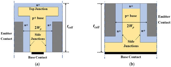 In this study, the proposed flipped npn solar cell microstructure has the same design parameters as the conventional npn structure discussed in our previous work [22], except that the flipped structure has a buried emitter which minimizes the shadowing effect, as is depicted in Figure 1a. The emitter perimeter of the flipped solar cell is larger than that of the conventional solar cell. The p + volume, which is considered as the active region, is also larger in the flipped solar cell. The main parameters of the flipped structure are summarized as follows. The p+ base width is 2Wp where Wp is the width of the base region, which is chosen to be Wp = 8 µm, while the width of the n+ side wall emitter is denoted by Wn and is set to 0.18 µm, and the thickness of the cell is termed by tcell and is taken to be 80 µm, a typical value for thin wafers. The doping levels of the p+− base, n+-side wall and top regions are Np+,base, Nn+,emitter and Nn+,top, respectively, where their values are Np+,base = 1018 cm−3 and Nn+,emitter = Nn+,top = 5 × 1019 cm−3. The n+ layer thickness is tn+, which is fixed at 0.1 µm by adjusting the diffusion process through the process simulator. The criteria for choosing such design parameters values were thoroughly argued in our previous work [19,22,23].
