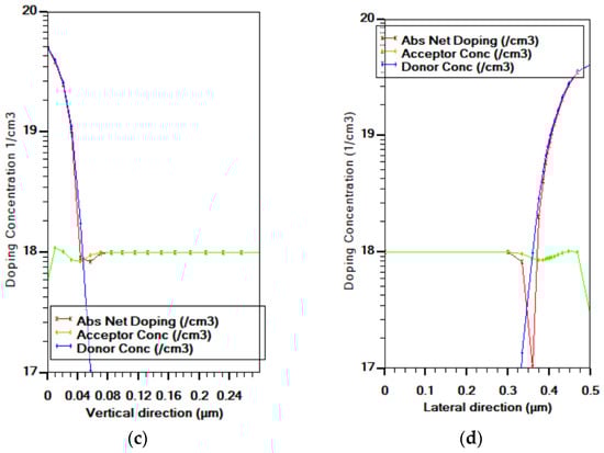 The flipped structure using SILVACO Athena process simulator: (a) cross-sectional view for the whole cell showing the absolute net doping contours in cm−3, (b) a close view near the emitter region, (c) vertical cutline (perpendicular to the upper surface) showing the doping profile of the vertical pn junction and (d) lateral cutline showing the doping profile of right lateral pn junction.