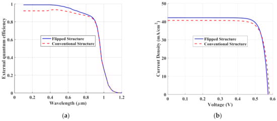 A comparison between the conventional npn and flipped structures: (a) external quantum efficiency (EQE) and (b) illuminated J–V characteristics.