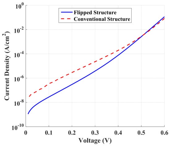 Comparison of J–V dark characteristics between the flipped and conventional structures.