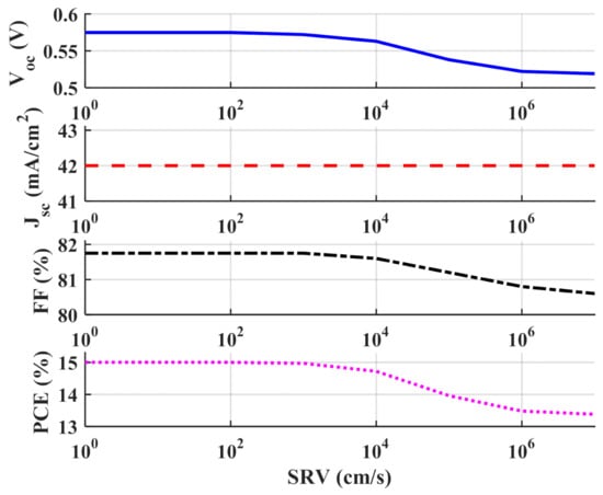 Again, to explain the influence of SRV on the Voc, we simulated the dark characteristics for different cases of SRV. The extracted reverse saturation current of the equivalent diode around the Voc is displayed in Figure 6. The reverse saturation current is constant for a SRV up to 103 cm/s. Then, it slightly increases up to 104 cm/s followed by a significant increase up to SRV = 106 cm/s. Beyond this value, the reverse saturation current becomes almost constant. The trend of the reverse saturation current is the same as for Voc, as expected.