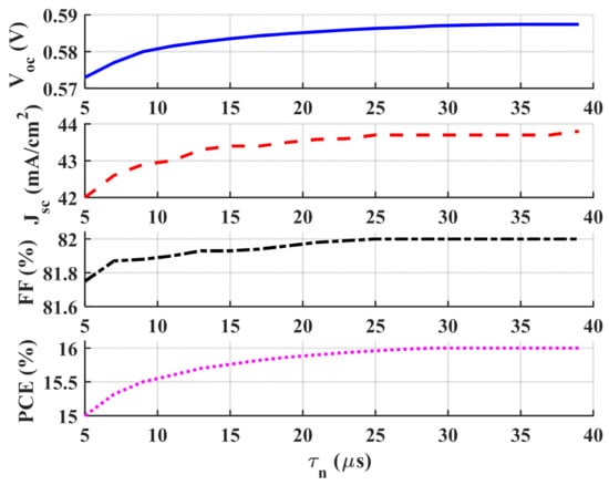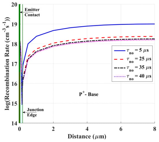 where Nref = 5 × 1016 cm−3 and Np+,base = 1018 cm−3, and the constant γ is assumed to be 0.5 [20]. For the simulated heavily doped wafers, the bulk lifetime τno was assumed to be in the range of 1 µsec–40 µsec [42,43]. The influence of the bulk lifetime of carriers on the performance parameters of the flipped structure was examined and is presented in Figure 7, which demonstrates these parameters. As evident from the figure, the photovoltaic parameters are boosted by increasing the value of the lifetime up to about τno = 30 μs, resulting in an efficiency of about 16%. Beyond this value of base lifetime, the performance saturates. The increasing trend in the performance parameters of the cell is expected as the lifetime has a strong impact on the dark and illumination characteristics. It is clear from the figure that the increase in the bulk lifetime raises both the short-circuit current density and the open-circuit voltage. The boost in the Voc is due to the increase in the short-circuit current and the decrease in the reverse saturation current [18]. The saturation of the photovoltaic parameters of the flipped structure with the lifetime is because of the fact that as the lifetime increased, the diffusion length increases such that it becomes much greater than the base width. In this case, the current is controlled by the base width rather than the diffusion length, implying a constant efficiency for higher lifetime values. These results could also be explained by the recombination rate along the lateral distance of the cell structure for different values of base lifetime. The recombination rate, shown in Figure 8, decreases as the lifetime increases from 5 µs to 25 µs. When increasing the lifetime above 25 µs, the recombination rates have an insignificant change, which validates the findings in Figure 7.