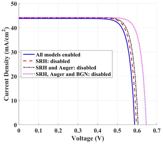 Finally, we investigated the limit of the efficiency when non-radiative recombination losses were disabled. So, SRH and Auger recombination mechanisms were deactivated in the following simulation. Figure 9 displays the impact of the various recombination and BGN models on the J–V characteristics. The different cell performance metrics of the simulation cases are recorded in Table 3. τno is taken to be 30 μs when all models were included. As can be inferred from the figure, the Voc is enhanced and the Jsc slightly improves as well when the SRH recombination is neglected. On the other hand, Auger recombination has a similar impact when compared to the SRH model. An efficiency of 16.85% can be obtained when neglecting both SRH and Auger models. In addition, when deactivating the BGN model, an efficiency of 18.17% and a high Voc of 0.647 V are obtained. This means that the limiting factor of the Voc degradation comes mainly from the BGN effect. We are working on such impacts and the different ways to alleviate them to complete the design before fabrication of this type of cell.