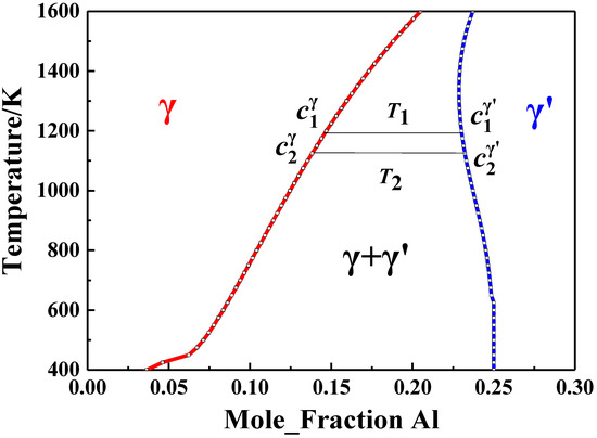 The phase diagram of the binary Ni–Al system can be calculated using the Thermo-Calc software (Version 2015a. Created by Sundman, Jansson, Ågren et al. Royal Institute of Technology (KTH), Stockholm, Sweden) [] with TCNI7, as shown in Figure 1. According to the phase diagram, for given temperatures T1 and T2, the equilibrium concentrations and of the γ phase and and of the γ′ phase tie-lines can be obtained, respectively. Then the values of , , and can be determined using Equation (9).