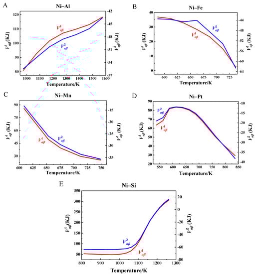The 1st and 2nd nearest-neighbor interaction energies ( and ) of the Ni–X (X = Al, Fe, Mn, Pt, or Si) alloy are shown in Figure 2. It is obvious that and increase with temperature in the Ni–Al alloy, while showing the opposite trend in the Ni–Mn alloy. There is a small fluctuation in the curve of the Ni–Fe alloy between 620 K and 720 K. In the Ni–Pt alloy, as the temperature increases, and first increase and then decrease, with maxima at about 85 meV/atom for and −12 meV/atom for at 612 K. For the Ni–Si alloy, and are stable at lower temperatures then grow rapidly above 1000 K.