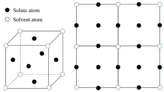 Although it is straightforward and desirable to perform three-dimensional (3D) simulations using the microscopic diffusion equations, a two-dimensional (2D) simulation is much less computationally intensive. In addition, its visualization and the analysis of the atomic configuration are much easier. Thus, all the results obtained in the present paper are reported using a 2D projection of a 3D system. This is equivalent to assuming that the occupation probabilities do not depend on the coordinate z along the [001] axis []. The γ′ domain can be identified by the solute atoms arranged in lattice sites, which is consistent with the projection of the γ′ phase, as shown in Figure 3.