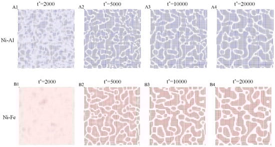 Figure 4 shows the morphological evolution of the Ni–Al, Ni–Fe, Ni–Mn, Ni–Pt, and Ni–Si alloys versus time ( is defined as , where is the simulation time and is the time step) at 1574 K, 686 K, 618 K, 638 K, and 1162 K, respectively. In the initial aging stage, the atomic ordering process of the γ phase leads to atomic redistribution. As the segregation of solute atoms in the γ phase occurs, the γ′ phase begins to precipitate from the matrix γ phase in a circular random distribution, as shown in Figure 4A1–E1, A2–E2. The interface between the γ and γ′ domains is decentralized. Furthermore, the morphologies shown in Figure 4A3–E3 illustrate the process of γ′-particle growth, where the small γ′ particles gradually merge with each other and grow, resulting in irregular shapes. Finally, the two-phase equilibrium of coexisting γ + γ′ is established, as shown in Figure 4A4–E4.