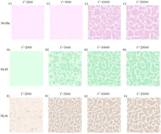 Microstructural evolution at simulation time t* = 2000, 5000, 10,000, and 20,000 for: Ni–Al at 1574 K (A1–A4); Ni–Fe at 686 K (B1–B4); Ni–Mn at 618 K (C1–C4); Ni–Pt at 638 K (D1–D4); Ni–Si at 1162 K (E1–E4).