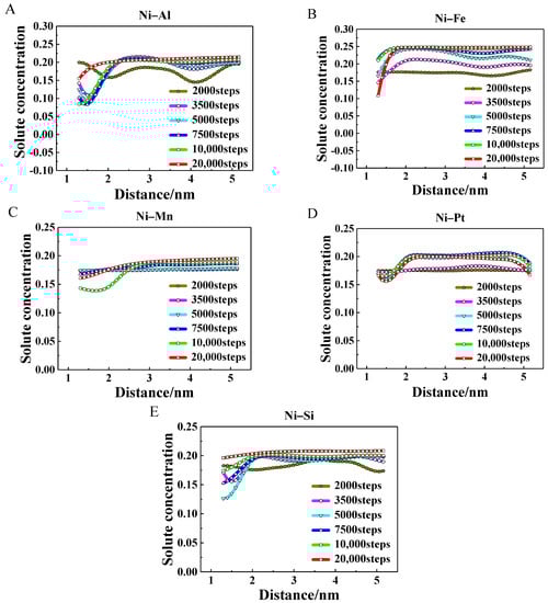 Variations of the solute concentration with distance for: (A) Ni–Al; (B) Ni–Fe; (C) Ni–Mn; (D) Ni–Pt; (E) Ni–Si.