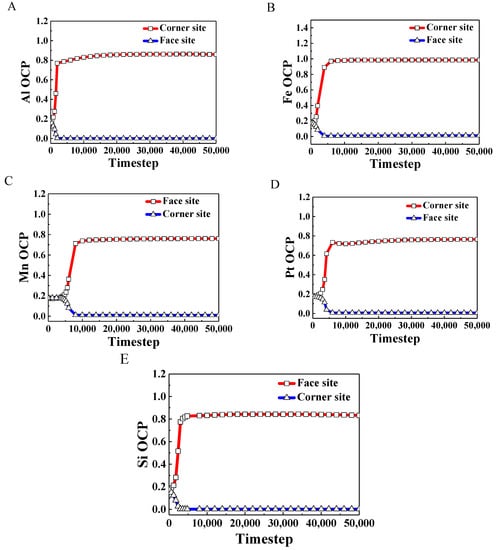 Occupancy probabilities (OCP) of solute atoms for: (A) Al; (B) Fe; (C) Mn; (D) Pt; (E) Si at corner and face sites as a function of timestep.