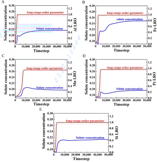 This describes the ordering degree with respect to the order parameter. Here, and are the average occupation probabilities of the alloy element in the site (face site) and in the unit cell (including corner and face sites), respectively. When , this means that alloy atoms are distributed equally at the lattice site () and around it. When or , this means that alloy atoms in the unit cell occupy corner sites only, so that the lattice is in a completely ordered state. The temporal evolutions of the long-range parameter and the solute concentration are shown in Figure 7. There are two stages during aging. Firstly, corresponding to the transitional ordering stage, the long-rang-order parameter and the solute concentration rise rapidly, indicating that the disorder–order transition occurs over time. Then the two-phase equilibrium is established, and the long-range-order parameter remains stable. From Figure 7, it can be observed that the long-range-order parameter reaches a steady state earlier than the solute concentration in all alloys, which indicates that the ordering event of the order parameter occurs first and is completed within 10,000 timesteps. Interestingly, there is a bump in the solute concentration during the early stages. This indicates that the solute concentration decreases slightly during coarsening, then increases to a steady value through uphill diffusion. Finally, when the solute concentration reaches an equilibrium value, the stoichiometric Ni3X (X = Al, Fe, Mn, Pt, or Si) precipitates are formed, which corresponds to the migration of solute atoms from the γ boundary to the γ′ phase. Compared to other alloys, the clustering behavior of solute atoms in the Ni–Mn alloy (Figure 7C) lags significantly behind the order parameter, which reveals that the γ′ precipitates formed in the early stage are supersaturated and unstable, resulting in the solute atom Mn migrating from the γ′ phase to the boundary.