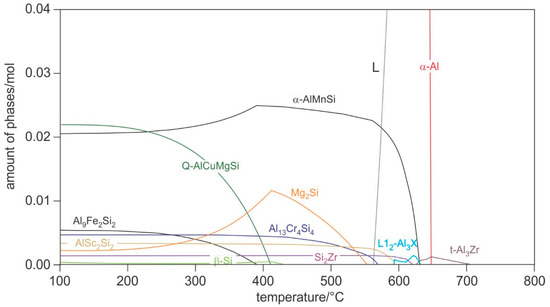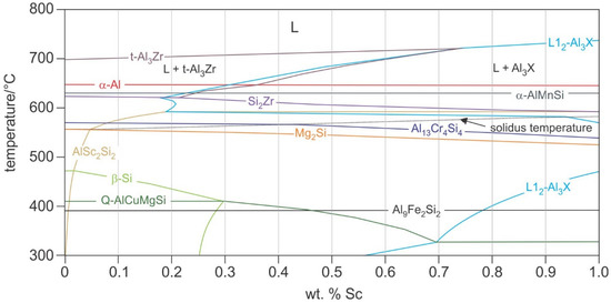 The main observations obtained from both figures are given below. The liquidus temperature increases from 700 °C to 735 °C. The primary crystallisation of tetragonal t-Al3Zr takes place up to 0.73% Sc, while cubic L12-Al3X (X = Sc, Zr) forms first at higher contents. Both phases disappear during equilibrium solidification. During solidification, the phases α-Al, α-AlMnSi, Si2Zr, and AlSc2Si2 also form. The solidus temperature increases from 560 °C (without Sc) to 585 °C (1% Sc). The CALPHAD calculation predicts the formation of Al13Cr4Si4, Mg2Si, β-Si, Q-AlMgSiCu, Al9Fe2Si2, and L12-Al3X in the solid state. The addition of Sc hardly affects the formation temperatures of α-Al, α-AlMnSi, Si2Zr, Al13Cr4Si4, Mg2Si, and Al9Fe2Si2.