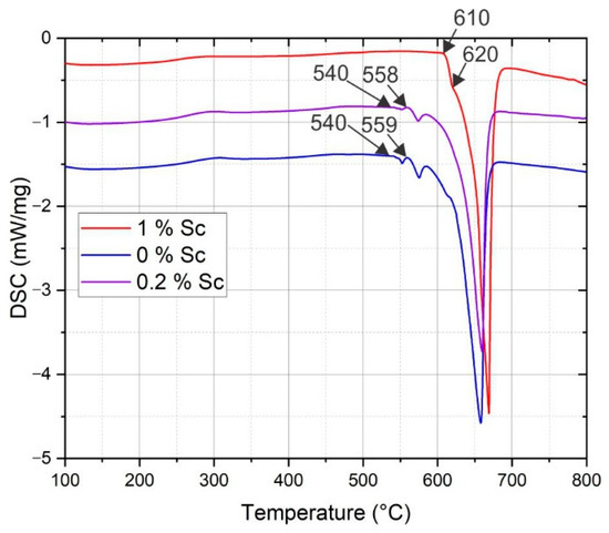 Figure 3 shows the DSC heating curve of all alloys. The addition of 0.2% Sc did not strongly affect the shape of the heating curve. The incipient melting point was around 540 °C, 10–20 °C below the calculated solidus temperature. On the other hand, the observed incipient melting point in 6086-1.0Sc was more than 20 °C higher than the calculated value. The peaks of low melting constituents disappear with the addition of 1% Sc.