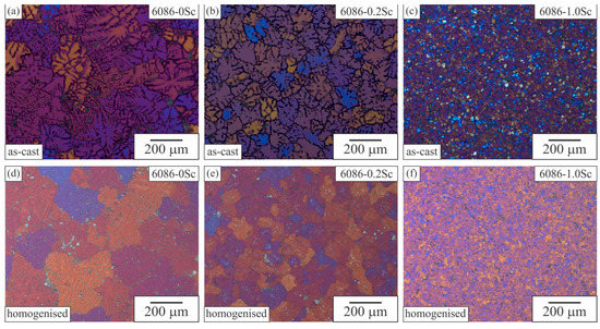 Figure 4a–c show the grain structure of the aluminium-rich solid solution α-Al of the investigated alloys in the as-cast condition. The addition of Sc to AA 6086 strongly decreased the grain sizes (Table 2), also found in other Al alloys [13,15,35]. The addition of 0.2% Sc to this alloy decreased the grain size of equiaxed dendritic grains by about 40%, retaining the secondary arm spacing (27–29 μm). The addition of 1 wt.% Sc not only decreased the grain size by five times, but the grains became non-dendritic. The prolonged homogenisation treatment (520 °C, 40 h) did not considerably change the grain sizes (Figure 4d–f), which indicates a high resistance to grain growth. Despite some differences in microstructure, the hardness of all alloys in the as-cast state was similar (6086: 89.0 ± 0.5 HV 30; 6086-02Sc: 91.8 ± 3.1 HV 30; 6086-1Sc: 89.5 ± 2.5 HV 30).