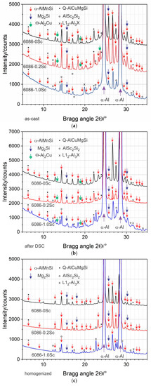 Slow cooling during DSC caused much larger α-Al crystal grains and coarser intermetallic phases (Figure 9). The phase α-AlMnSi was present in the shape of Chinese script in 6086-0Sc and 6086-0.2Sc alloys; it also contained Cr and Fe. In these alloys, a ternary constituent composed of α-Al, β-Si, and Mg2Si formed in larger interdendritic spaces; very often, discrete bright t-Al3Zr was observed in this region. The ternary (α-Al + β-Si + Mg2Si) constituent was not present in 6086-1.0Sc. Instead, a structure consisting of L12-Al3X, α-AlMnSi, and AlSc2Si2 was frequently encountered (Figure 9f). The XRD patterns were similar to that in the as-cast state (Figure 6a,b).