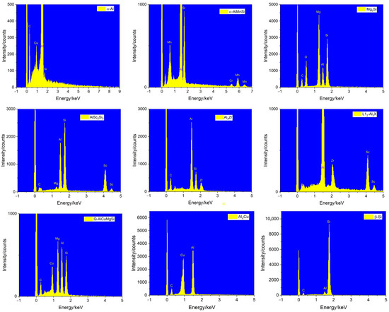 EDS in SEM was used to mainly determine the phases. Many phases were very small in size, thus we used a low voltage of 5 kV to reduce the interaction volume of electrons significantly, which almost eliminated the signal arising from the surrounding phases, mainly in the matrix α-Al. Figure 7 shows the typical spectra of all phases that represented a template for the identification of phases in the microstructure.