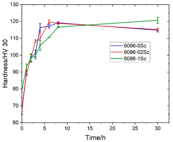 The final properties of Al-Mg-Si alloys are normally obtained by artificial ageing. The most common is the T6 temper, consisting of homogenisation (solution treatment) and artificial ageing. The investigated alloys were homogenized at 520 °C for 6 h and then artificially aged for 6 h at 180 °C. The ageing duration was determined after isothermal ageing up to 30 h at 180 °C (Figure 11). There were no significant differences between the alloys without and with 0.2% Sc. The peak hardness was achieved in the range of 5–7 h. It is also essential that the hardness was reduced by less than 10% after 30 h of ageing, which indicates a nice stability of properties. On the other hand, the hardness of 6086-1Sc was higher for about 10 units after homogenization, probably because of a higher volume fraction of the primary L12-Al3X phase and smaller grain sizes. However, the increase in hardness was smaller, and it did not achieve the maximum value after 30 h of ageing when it attained the level similar to the peak hardness in other investigated alloys.