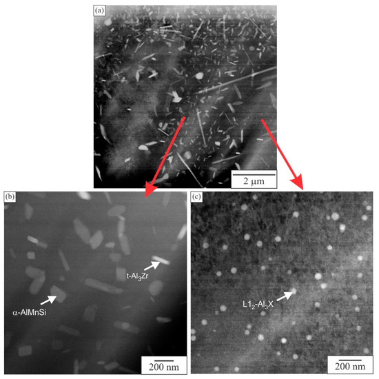 HAADF (high angle annular dark field) micrographs of the sample 6086-0.2Sc in the T6 temper. (a) A larger area, (b) the region with smaller dispersoids (t-Al3Zr and α-AlMnSi), and (c) in between the coarser plates (L12-Al3X).