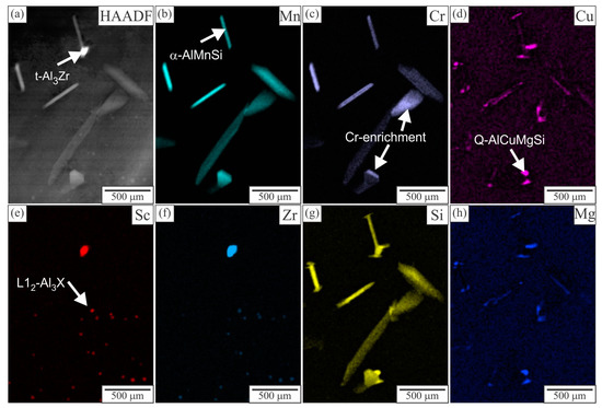 Distribution of the elements within the matrix in the area with coarser dispersoids (T6 temper). (a) HAADF micrographs, mapping of (b) Mn, (c) Cr, (d) Cu, (e) Sc, (f) Zr, (g) Si and (h) Mg.