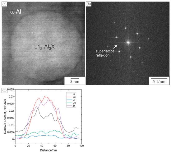 The formation of L12-Al3X particles is one of the main reasons for the addition of Sc to Al alloys. Therefore, the spherical particles were analysed in detail (Figure 14). Figure 14a shows the HRTEM image and Figure 14b the corresponding FFT transform. The zone axis of α-Al was (110), and the precipitate possessed a cube orientation relationship with the matrix, which is typical for L12-Al3X. EDS analysis showed that the precipitate contained mainly Zr and Sc, but also a substantial amount of Si (Figure 14c). The quantification of several particles revealed that they contain 18.3 ± 4.4 at. % Zr, 3.0 ± 0.7 at. % Sc and 10 ± 2.8% Si.