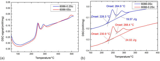 DSC heating curves for the alloys 6086-0Sc and 6086-0.2Sc. The initial condition was homogenisation for 6 h at 520 °C. (a) The whole range, (b) limited range with onset temperature and enthalpies of precipitation.