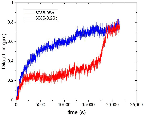 Figure 16 shows the dilatation of AA 6086 and AA 6086-0.2Sc during isothermal annealing at 180 °C. During ageing the length increased in both specimens. The increase in length in AA 6086 was continuous, and the dilatation rate decreased with time. On the other hand, in alloy AA 6086-0.2Sc, a plateau was attained within one hour, and the dimensions did not change for several hours. After approximately 17,500 s the volume started to increase abruptly, until reaching almost the same value as an Sc-lean alloy. Thus the addition of Sc delayed the beginning of precipitation, but after it started, the precipitation was rapid and, after a short period of time, both curves coincided.