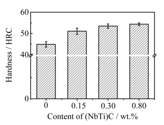 - The hardness of ICCI increased with an increasing addition (NbTi)C particles. When the addition amount was 0.80 wt %, the hardness reached 54.4 HRC, which is 21.1% higher than that without addition, mainly due to the increase and refinement of carbides.