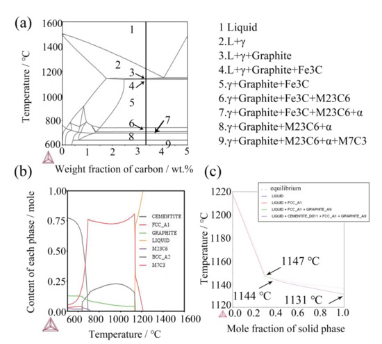 - The Thermo-Calc simulation has shown that during solidification, the γ phase, graphite, and Fe3C precipitate in liquid phase in turn, and the liquid phase transformed into a solid phase at 1131 °C. The eutectic (NbTi)C particles may be formed in the transformation of L→γ + (NbTi)C + Fe3C.