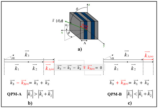 From the corpuscular point of view, the AQPM condition , with m = ± 1, corresponds to momentum conservation between three photons and a quasi-particle depicting the periodically poled crystal through its grating vector , the latter bringing no energy. In the case m = 1 (scheme-A), three particles with and are “consumed” to produce the new particle with the wave vector ; this is somehow equivalent to what occurs while considering Third-Harmonic Generation (THG) governed by the third-order electric susceptibility. Case m = −1 (scheme-B) deals with two particles and that are “consumed” to produce a new pair of particles, one being the new photon associated with and the other one being the energy-less quasi-particle bearing the momentum quantum transferred to the grating, with ; this is similar to another four-particle interaction corresponding to Four-Wave Mixing (FWM) [21].