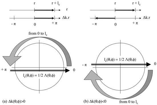 where is the refractive index in the direction associated with the interacting wavelength , with i = 1, 2, 3. In this scalar description, scheme-A and scheme-B AQPM conditions are described by and , respectively. It is important to notice that AQPM processes may be understood as a continuous evolution of the phase-mismatch from 0 to +π or to −π when the distance of propagation continuously evolves from 0 to . The phase-mismatch is then followed by a sudden phase shift of ±π at the crossing propagation through a given poled domain to the next inverted one: this phase shift resets in phase the nonlinear polarization and the radiated field at the entrance of each inverted domain, for both APQM schemes A and B, as illustrated in Figure 2a,b, respectively.