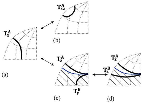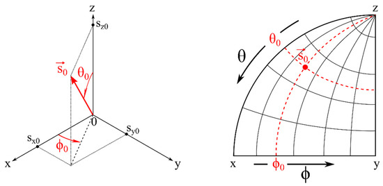 As already defined, spaces of AQPM solutions correspond to the spherical angles being solutions of Equation (1). These angular solutions can be depicted in Cartesian representation, such as curves (or equally). Alternatively, there is another suited representation known as the Wulff diagram, which corresponds to a stereographic projection of one octant of a sphere in a plane, as shown in Figure 3.