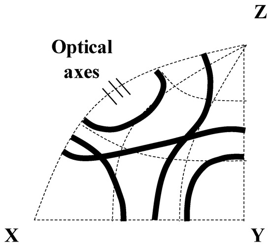 BPM Topologies of biaxial media, which are also possible topologies for AQPM. The three lines crossing the xz-plane stand for the optical axes at the wavelengths of the three interacting waves.