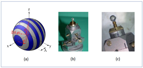 The measurement of BPM, as well as AQPM directions, requires direct access to any direction of propagation in the dielectric frame of the considered material under study. The optimal methodology is to consider materials shaped as a sphere with its surface polished to optical quality [25,26]. Such a spherical sample needs to be oriented both from crystallographic and optical points of view by means of correlative X-ray diffraction and double refraction observation, respectively. Then, the full angular distribution of both linear and nonlinear optical properties can be addressed using only one sample of the studied sample by rotating the sphere within a high precision goniometric setup, which can be an Euler circle as well as a Kappa circle. In this way, it is possible to obtain direct access to the directions of propagation that correspond to solutions of BPM or AQPM interactions, whatever the considered type of polarization scheme or the involved set of wavelengths. Doing so allows us to propagate light along a diameter of the sphere by keeping normal incidence which is not possible while considering slab samples [25,26]. Figure 6a illustrate the scheme of an oriented periodically poled crystal. Figure 6b,c show the remarkable realization of millimetric-scale oriented periodically poled spherically shaped crystals of the uniaxial 5%MgO:PPLN [16,17,18] and of the biaxial PPRKTP [20,21], respectively.