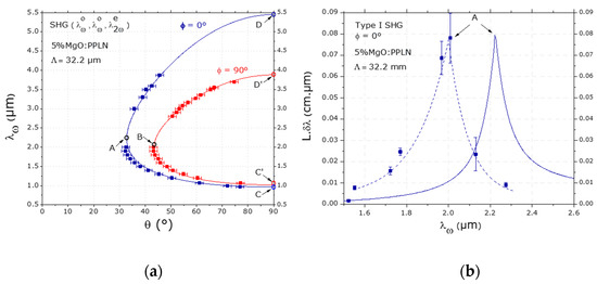 The simplest demonstration of AQPM theory and associated solutions from Equation (2) comes from SHG experiments. AQPM SHG directions were investigated in a negative uniaxial 5% MgO:PPLN shaped as a sphere with a diameter of 3.9 mm. The nonlinear grating was oriented with domains perpendicular to the x-axis, similarly to the configuration described in Section 4, with a nonlinear period = 32.2 µm and a 50% duty cycle ratio defined as the proportion of inverted domains with the same dimension. As shown in Figure 7a, type I SHG AQPM tuning curves were recorded with respect to the fundamental wavelength, either in the xz-plane ( = 0°) or in the yz-plane ( = 90°), the latter corresponding also to BPM solutions, as the effective period in the yz-plane.