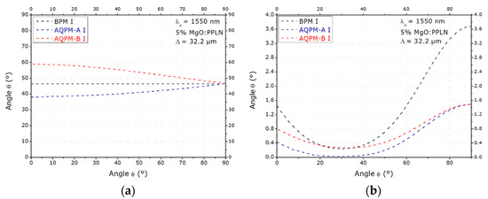 Comparison between AQPM and BPM solutions in the case of a type I SHG interaction at fundamental wavelength = 1550 nm in 5%MgO:PPLN with a poling periodicity Λ = 32.2 μm: (a) AQPM directions of scheme-A (blue dashed line), scheme-B (red dashed line) and BPM solutions (black dashed line); (b) Corresponding Figures of Merit.